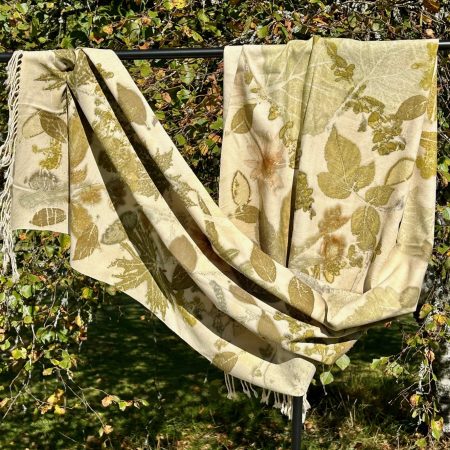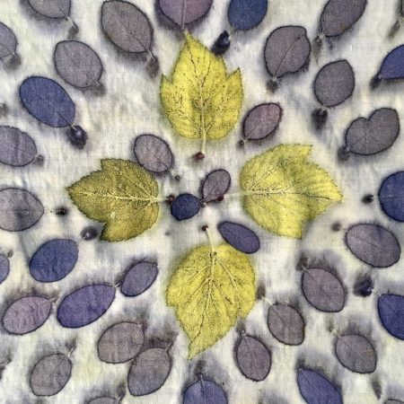 Jag arbetar med ”Botaniska tryck” på naturmaterial, d.v.s. kontakttryck av växter eller växtdelar på tyger, läder och papper.